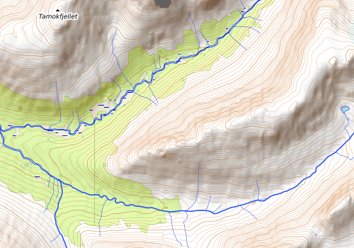 Vassdalsfjellet er langt fra den mest populære kommunetoppen, men de som hadde vært der hadde valgt to ulike ruter. Jeg vurderte 500fjell (Sondre Kvambekk) sin variant, han gikk opp vestryggen og gikk topplatået bortover. Problemet med denne ruten er en loddrett hammer som må forseres og i 2011 da han gikk måtte han ned på en bratt bre for å forsere hammeren. Dette er jo noen år siden så det kunne jo tenktes at breen hadde endret seg siden den gang og at det nå kanskje var enda vanskeligere å passere dette punktet. Jeg bestemte meg derfor for den litt lengre varianten som otto (Otto Lund) og co gikk i 2009 via Finndalsbotn. Fra E6 ved Øvergård kjørte jeg fv.87 gjennom Tamokdalen til Harkinn der det er en stor parkeringsplass rett ved veien Harkinn parkering. Et stort skilt med Camp Tamok her. Det går ann å kjøre videre innover til Camp Tamok og muligens enda lengre om man har en bil med høy bakkeklaring, men jeg valgte å parkere her ved hovedveien. Fulgte først fin grusvei ca 600 m inn til Camp Tamok der det var flere hytter, telt og gammer. Veien videre var litt dårligere standard, men går sikkert bra å kjøre her også med høy bil. Jeg fulgte det som så ut som hovedveien i kryss (holdt til høyre i alle kryss). Det lå flere døde lemmen på veien. Veien ble etter hvert ett ATV spor som jeg fulgte først over en bru over Vassdalselva og langs Finndalselva. Like etter en nedbrent hytte forsvant ATV sporet og jeg fulgte diverse dyretråkk innover Finndalen. Lettgått terreng her, sola varmet og utsikten var upåklagelig, så det ble en fin gåtur innover. Jeg gikk nesten inn til Finndalsvannet før jeg krysset over elva, ingen problem å finne ett greit sted å krysse den tørrskodd i dag. Nå begynte steinura og det var slutt på lettgått terreng. Elva ned fra 938 vannet var også lett å krysse, men nå begynte stigningen for alvor. Det er veldig bratt opp til toppen herfra, men jeg tok sikte på ett område med vegetasjon som jeg fulgte oppover. Gikk sakte for det var områder med løs stein og løst underlag. Måtte tidvis klyves litt, men det var tørt og fint, så det gikk greit å komme seg opp. Det flatet ut på rundt 1380 moh, og derfra var det grei steinur å gå på til toppunktet. Det var bygd en liten varde på topplatået. Gikk litt rundt på toppen og nøt utsikten og det fine været og tok en matbit før jeg startet på tilbaketuren. Brukte ca 4,5 time til toppen. Nogenlunde samme vei tilbake men tok en liten tur langs ryggen til 1566 toppen før jeg gikk ned. En fjellvåk som holdt øye med meg og ett par levende lemmen samt noe småfugl å se, men ingen ryper. Med unntak av den bratte oppstigninga til toppen så var det en veldig fin tur å gå, kommer fort inn i glissen bjørkeskog med utsikt og mesteparten av turen er over skoggrensa i kjempefint terreng innover Finndalen. Var tilbake ved bilen etter 9,5 timer på tur.