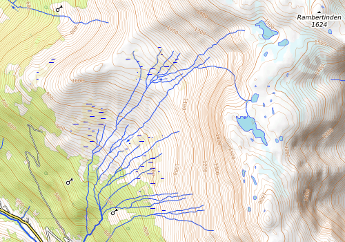 Ikke så værst værmeldinger så vi satset på å få til en ny kommunetopp denne helga. Kjørte til Grønsberg p-lomme og satte bilen her. Skiltet mot Grønsberg fra "hovedveien". Bratt og svingete, men caddyen kom seg greit opp. Det hadde blitt mørkt så da var det bare å rigge seg til for overnatting inne i bilen. Første gang vi skulle overnatte i den ny kjøpte bilen så var litt spent på hvordan det skulle funke, men sov som en stein. Var faktisk nordlys om natta. Neste morgen valgte vi å gå til Nummedalsstølen. Veien videre fra parkeringa er merket med privat så derfor lot vi bilen stå og tok beina fatt. Fikk gjort unna endel høydemetre på vei oppover til Nummedalsstølen. Fin vei å gå på så det gikk greit oppover selv om vi var litt tungt lastet med telt og overnattingsutstyr. Ved øvste Nummedalsstølen var det enkelt å finne stien videre mot Flateng. Lettgått bortover her. Litt før vi kom til Flateng fant vi en fin leirplass godt gjemt blant einerbusker. La fra oss alt ekstra utstyr, hilste på sauene til Jon som andre også har hatt nærkontakt med og fortsatte videre oppover mot Stuasetbotnen. Fulgte tråkk i starten, men mistet de etterhvert. Det gjorde ikke noe for det var relativt lettgått terreng oppover her. Da vi kom til Stuasetbotnen skremte vi opp en liten rypeflokk. Gikk på nordvest siden av elva oppover og like før den lille fossen var det varder som markerte veien videre oppover langs bekken. Greit å gå her. Vi gikk mellom 1484 høyden og 1453 vannet, og så var det bare å prøve å finne greiest mulig vei videre opp til toppen av Nummestolane. Litt uryddig terreng med mange steiner som ligger igjen etter isbreene men relativt lettgått og "linjer" i terrenget som var fine å følge. Kjempefin utsikt fra toppen og god utsikt til Fresvikbreen som nettopp mistet sin status som kommunetopp til fordel for Nummestolane etter nedsmelting. Tilbake gikk vi en rute vest for 1493 vannet istedenfor på østsiden som vi gikk opp. Jeg ville opp på Rambergtinden også så jeg tok en liten avstikker innom den. Gikk på nordsiden av 1453 vannet da jeg gikk ned fra Rambergtinden og her var mye steinur og litt bratte skrenter så var nok ikke den optimale veien. Var stort sett barmark nå, bare på det lille som var igjen av breer det var snø/is. Gikk så ned til der vi hadde lagt fra oss teltet og satte opp leir før vi koste oss med mat og pinnebrenner bål. Neste dag tok vi en rolig morgen og fikk selskap av flere sauebønder som var oppe for å se etter sauene sine. Ikke bare Jon som har sauer her. Bestemte oss for å gå stien ned istedenfor veien, men anbefaler veien istedenfor stien. Vi gikk feil nesten helt i starten og var på vei mot skor. Mange sauetråkk her så ikke lett å finne rett sti, men vi snudde og fant rett vei nedover etter en liten omvei. Bratt og ganske tilvokst sti som ikke alltid var like lett å følge. Bjørn var med.