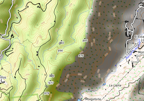 Vi kom etterhvert til ett skilt mot Los Acevinos og Hermigua, men var litt usikre på om skiltet pekte nedover en sti eller videre bortover veien vi allerede gikk på, men vi satset på at stien var det rette alternativet så vi fulgte den nedover. Den endte i ett veikryss med tre asfalterte veier der to var avstengt med kjetting. Det lå ett skilt nede på bakken med Acevinos cedro som pekte oppover stien vi kom fra. Det var en sti som fortsatte nedover også som vi bestsemte oss for å forsøke. Den så ikke ut som den mest brukte stien, men vi gikk ett godt stykke før vi begynte å lure på om det var rett vei og bestemte oss for å snu. Når vi så på sporet i ettertid, så ser det ut som vi hadde kommet ned på rett sted om vi hadde fortsatt på stien. Istedenfor gikk vi opp igjen til veikrysset og fulgte den eneste veien som ikke var avstengt med kjetting.