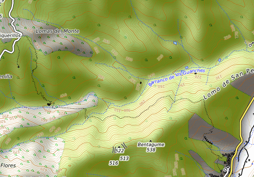 Stien fører opp til den lille ryggen Lomo de San Pedro. Herfra går den i dalsiden innover mellom busker og terrasser. Når stien kommer i bunnen av dalen går den mellom noen åkerlapper og innegjerdede områder og opp på motsatt side av dalen. For det meste god sti. Man går forbi en grind inn til en bygning nede i dalen. Her lå det ett skilt i gresset som peker mot stien videre oppover, stien tar en sving her. Man går gjennom to grinder før stien ender i en grusvei.