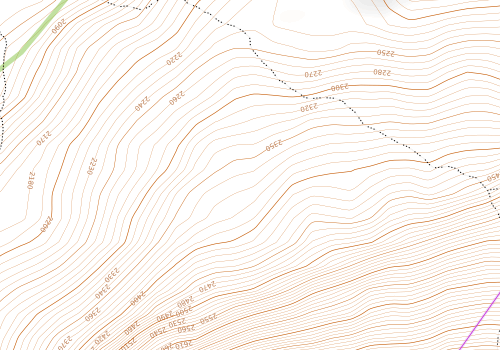Temperaturen var behagelig, knapt 20 gr C, og med en liten bris. Kjørbar vei i begynnelsen, snart over på tydelig sti, som lenger oppe forsvant i mer grovsteinet ut, selv om vi fulgte tracket rimelig slavisk. Bare langs en kort horisontal travers i noen løsmasser like under en liten hammer på knapt 2500m så vi igjen antydning til et tråkk, men det så ikke veldig trafikert ut..Et lite klyvepunkt uten særlig luftighet opp hammeren, og så åpenbarte det seg en lang bratt flanke i retning nordøstryggen, og nå beynte slitet. Her var igjen intet tråkk å se, bare løs grus og småsteinet ur laaangt oppover; mao skikkelig tungt terreng.