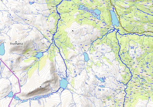 Vi gikk på vestsiden av det lille Rinnvannet og kryset over før elveosen i nord. Prøvde å holde høyden bortover siden for å få minst mulig stigning opp til turens siste topp; Raudfjellet. Utfordringen bortover her er at elva Rinda må krysses. Dette er ei stor elv som normalt har åpnet seg til påske. Der vi kom frem til elva var det bratte og dype kanter på begge sider og umulig å komme seg ned/opp med pulk og ski. Vi fulgte elva oppover men det så ikke enkelt ut. Jeg fryktet vi måtte helt opp til Rindvatnet igjen, men etter kanskje halve vegen opp fant jeg et sted der det så fremkommelig ut. Dessuten var det ei smal snøbru nede på elva. Vi kom oss heldigvis tørrskodd over men måtte bakse mye for å få opp pulken på den andre siden.