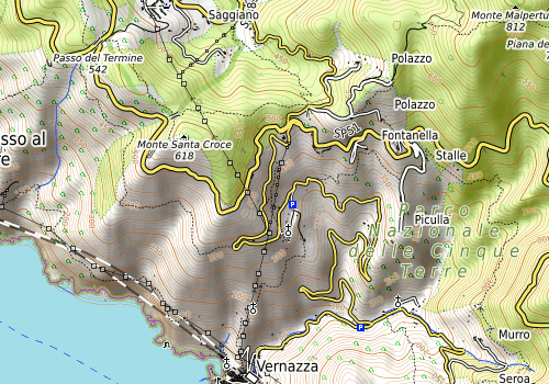 Jeg møtte en del folk fra Monterossa og opp til første kirken, deretter så jeg bare tre mennesker før jeg kom inn på kyststien like før Vernazza. Så vil man ha ro velger man bort kyststiene, men svette kommer på kjøpet. Trolig går det an å ta lokalbusser opp i åsene. Vi så stoppesteder, men sjekket aldri rutetider. Har siden sjekket opp at en må kjøpe Cinque Terra-kortet for å ta buss. Kortet er det samme som man MÅ kjøpe for å få adgang til kyststiene (kjøpes i en bu langs ruta)