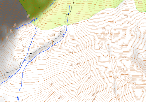 Nedkjøringa kunnen ha blitt tatt rett sørvestover fra varden, men vi valgte heller å gå tilbake ca. 50 meter langs ryggen og kjøre ei kort renne slik at vi kom ned lengre inne i botnen der snøen var mindre vindpåvirket. Skia ble på helt til bilen, selv om skikjøringa i skogen foregikk på i overkant tynt og mangeartet underlag.