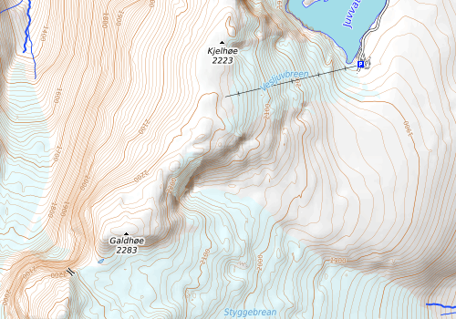 På Styggebrean kommer det opp en ny 2000-meterstopp etter hvert som breen minker. Den kalles Nunatak øst for Porten (2214) her på Peakbook. Det er en påminnelse om klimaendringene.