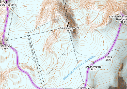 Etter noen dager i Valtournenche og Cervina var værmeldingene gode for den planlagte turen til Breithorn. Syns vi var tidlig ute, men da vi ankom Platou Rosa før kl 8 var det både turfolk og alpinister over alt. Vi tok på stegjern og bandt oss inn i tau som de andre, men på veg oppover skibakken virka det det ganske meningsløst å gå å surre med tauet. Nattefrosten gjorde at det var lettgått for oss på veg oppover og gode forhold for de som trente porter.