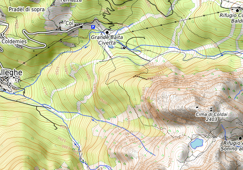Heis fra Alleghe opp til Coi. Deretter sti nr. 4 opp bratt renne til Lago Di Coldai. Topptur til Cima Di Coldai, luftig og bratt på toppen. Ned via Rifugio Sonino Al Coldai.