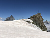 Vi stiger sakte og høyden er for min del påtrengende fra første meter. Etterhvert kommer vi oss opp på ca. 3800. Her må jeg gi meg for dagen. Jeg tar inn på restauranten på Kleine Matterhorn for en matbit og en pust i bakken. Maten smaker ikke og formen er dårlig. Retur samme vei, nå i kraftig vind og delvis tåke. Været forandrer seg lynraskt her.