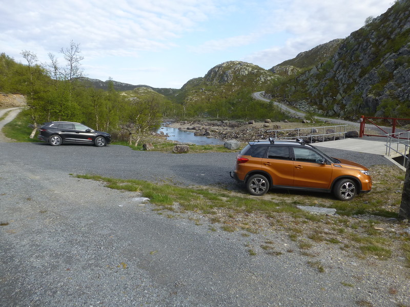Plass til 2-3 biler og så er det laget til benk i stein for rast.