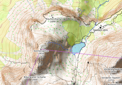 2) Sørflanken. Går i flanken øst for Søregga. Noen få partier med vaier/trinn (B), ellers klyving opp til grad 2 (UIAA). Skilta ved Coburger hütte og seinere ved stien fra hytta mot Biberwier Scharte. Stien mot innsteget sees tydelig i ura under flanken. Forsiktig merking (rødmaling) og rapellfester i nedre halvdel av ruta.
