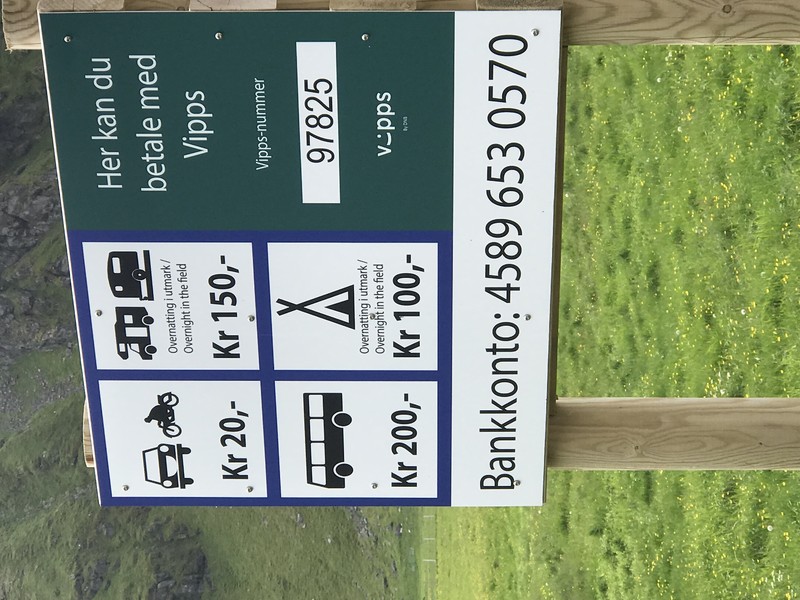 Vipps 20 kr for bil, 100 kr for telt, 150 kr for bobil/campingvogn (juli 2018).