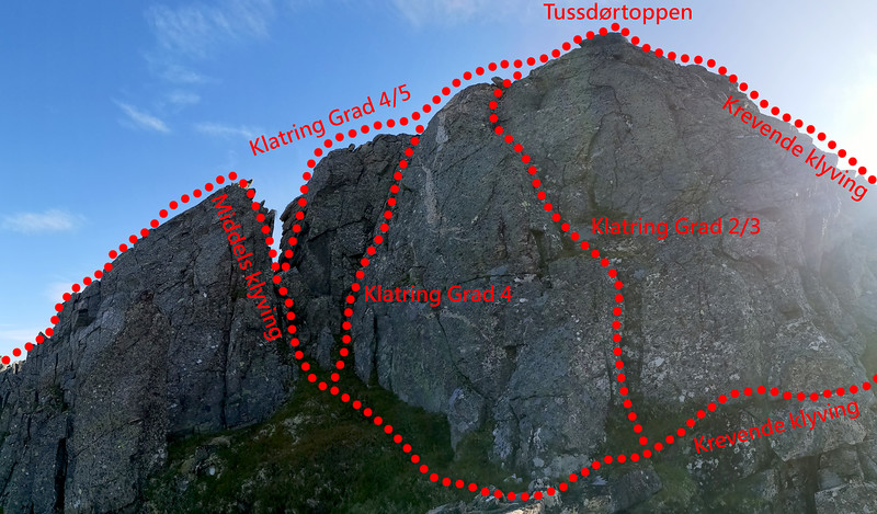 Denne trekanten gjelder for både gule og røde trekanter opp til Tussdørtoppen. Følger man ryggen opp blir man stoppet av ett kvast skar rett før toppen som man nesten kan hoppe over. Litt eksponert klyving ned i skaret fra nord, men gode tak gjør at man enkelt kommer seg ned. Alle varianter opp til Tussdørtoppen byr på spennende klyving eller klatring. Enkleste variant er å bestige toppen fra sør.