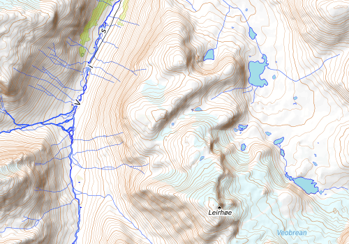 På veien opp, hallvveis over ryggen hørte vi tidenes dundring i fjellet. Det rista i alle organer. Det var hele skavlen på Leirhøe som kom seilende ned Veobraan sammen med en mengde fjell. En tydelig påminnelse om at man skal ha respekt for bratte helninger, skavler og sol! Derfor ble det ikke en veldig lang seanse på toppen før vi tok fatt på returen. Den gikk overaskende raskt og greit, samtidig litt lettere å gå oppover en nedover. Tilbake på toppunkten på ryggen tok vi av tauet. Fra her kunne man merke at snøen hadde forandret seg en god del, med litt mykere snø og mer gjennomslag.