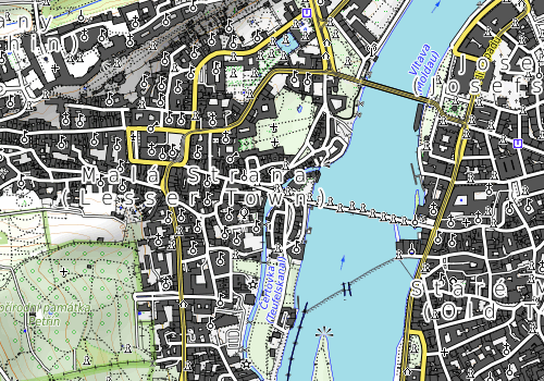 Utsikt over på andre siden av Vltava, Manesuv most med Petrin bak, og Vituskatedralen på Prahaborgen til høyre