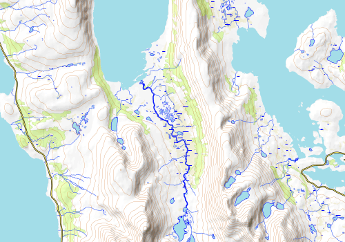 Jeg tok da en endelig avgjørelse på at det var ikke meningen på komme opp på disse toppene denne gangen. Jeg måtte være veldig forsiktig ned mot Skipsfjorden for steinene var som såpe. Nede i dalen krysset jeg over elven der hvor stien har et vadested (ikke merket på kart). Det skal sies at det kunne sikkert ha vært plasser ut noen steiner til uti elven for å komme seg over på en litt enklere måte. Det ble noen hopp og sprett før jeg var over.
