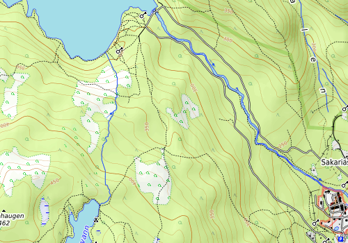 Deretter bar det gjennom skogen nedover mot vannet. Innså nokså raskt at å holde kompasskursen gjennom dette terrenget var for spesielt interesserte. Her gikk det rett opp og ned igjen på andre siden. Da er det best å la terrenget lage veien. Fulgte først en liten rygg før jeg endte opp i et bekkeleie. Siden det var godt med snø og jeg hadde truger var det egentlig ganske greit å gå ned her, men det hadde vært et mareritt å tatt samme veien opp eller om sommeren.