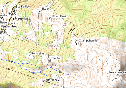 Planen var derfor å gå opp Pointe de la Pierre fra ei liten bygd som heter Ozein, på ca. 1400m. Turen går mye i slakt terreng på nord/nordvestsiden av fjellet, så det skulle være et trygt valg med god tørrsnø her. Det vi ikke hadde regnet med var at det var så tynt snødekke i forhold til det vi hadde opplevd i Chamonixdalen. Selv om det lå et lag på ca. 20cm fin snø under tregrensen, var det veldig lite, nesten ingen såle under 2000 moh, dvs. omtrent halvparten av nedkjøringa ville bli preget av stein og busker under skiene :( Derimot var det strålende vær med mye solskinn, nesten påskestemning!