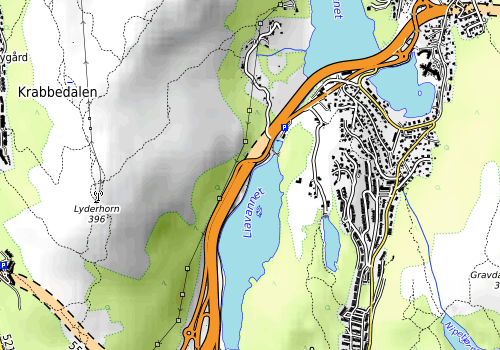 Jeg gikk så videre fra Lyderhorn til Skjenafjellet og Ørnafjellet før jeg tok ned til høyre og gikk en sti som ender mellom to hus rett før kommandantboligen og videre til Rema 1000 Nygård.