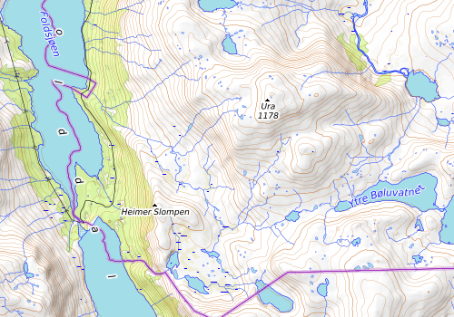 Været var som ventet ikke spesielt bra. Lavt skydekke og regn i lufta. Pakket kjapt sammen leiren og kjørte nedover til Foldsjøen for å gå tur til Ura. Det er to merkede løyper til toppen (begge med tydelig merket start med store infotavler ved vegen), men vi parkerte omtrent midt mellom disse to, der det går en gammel traktorveg. På den måten fikk vi til en fin rundtur uten så mye trasking på veg, og vi fikk dessuten en slak og snill start på dagen.