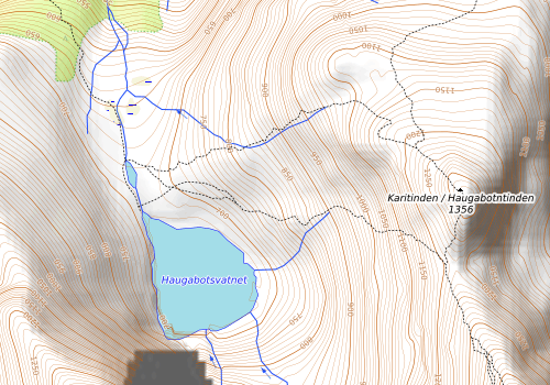 Retur ned flanke til Steinbotn med utgangspunkt i renna rett øst for storrenna. Viktig å finne riktig inngang rett over svaparti i utgangen av Steinbotn før vi fulgte morenerygg ned til Haugabotnvatnet.