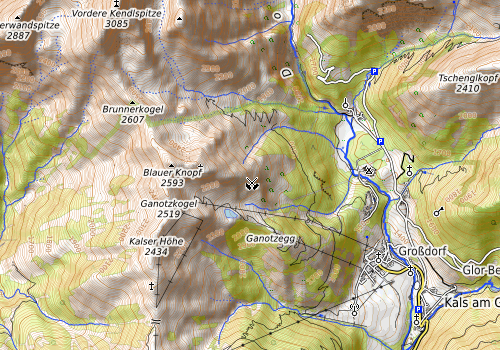We started from Spöttling-Taurer in the upper end of Kals am Grossglockner, crossed over the Kalserbach there to the western side of the valley, and ascended from there along the Mitterbach-valley towards Kereralm. From there, we continued upwards towards the Hohes Tor. At about 2000m sea-level, we ended up in a thunderstorm and started to feel somewhat uneasy, exposing us too much to the bad weather. We therefore turned around and descended, again, following a forrest road southwards from Kereralm (at about 1800m sea-level). We connected to the place, where a lift comes up from Grossdorf, connecting to Ganotzalm, further up. We continued on the forrest road, which leads up to the hut Glocknerblick on about 1950m sea-level. There, we had a nice rest and filled up some energy (unfortunately, the weather did not allow any views over to Grossglockner as the name of the hut would suggest). While two of us descended from there, returning to Spöttling-Taurer, the two others of us continued upwards from there, heading for Blauspitze. We found a nice hiking path that crosses over a little stream northwards, just a bit above Glocknerblick. This path then leads upwards along a relatively steep ridge (which is easy to walk, however!). At about 2300m sea-level, we found a place, which was marked as the entry point of a direct route up Blauspitze, continuing along the (more and more steep) ridge. We started to ascend along this track, but found out after a while that it was not responsible to continued without any climbing equipment. We found a way back down on the hiking path, which goes around Blauspitze on a lower level, directly connecting to the Hohes Tor from there. At about half of this connection, slightly above 2400m lea-level, a hiking-connection to Blauspitze splits off to the left (southwards). This was our chance to make it up Blauspitze and we enjoyed great views from the top shortly afterwards! We then descended back along the same path, got back onto the connection to the Hohes Tor, and followed this one, reaching the Hohes Tor soon after. From there, we headed back downwards towards Kereralm, and eventually also back down towards Spöttling-Taurer, from where we had started earlier this day, following the same path that we had taken up. All in all, this was a longer hike with quite some height meters and intermixed impressions from the weather, including a thunderstorm, some rain, but also very nice hours with great views---at least within the nearer surroundings! :-)