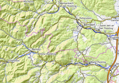 We started this bike trip near Medauhof, between Ödlitz and Berndorf. From there, we first descended towards Pottenstein an der Triesting, where we changed over to the other side of the valley. From there, we entered the long and nice Grabenweg-valley, which leads up to the saddle Am Hals at its very end. Mostly, this road is leading gently upwards, but at its very end, it becomes a little steeper and a nice challenge for cyclists, not talking here about challenges, which aggressive drivers occasionally impose on those on two wheels! On the other side of the saddle, we clearly enjoyed a longer and faster descent into the valley, which brings on out to Perniz. There, we basically turned left (into eastern direction) and followed the Piesting for quite a while on its way out of the mountains. At about Waldegg, we had the chance to leave the main road and continue along secondary roads on the left side of the valley until Markt Piesting. There, we took another turn to the left, ascending to another saddle, Auf dem Hart, in order to get over and back to Berndorf in the north. Descending towards Berndorf on the northern side of the saddle was then quick and easy, bringing us back the Triesting. To conclude, we just crossed the Triesting and ascended the short stretch back up to Medauhof.
