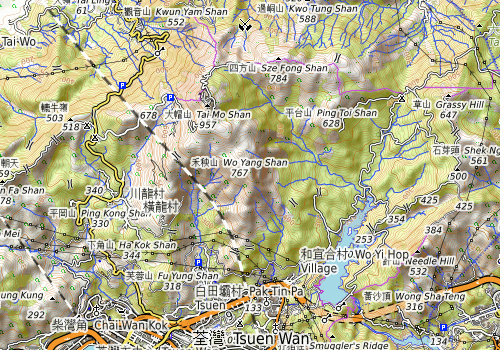 Jeg nådde toppen av Tai Mo Shan etter litt over 1 time i bedagelig tempo. Det høyeste punktet (957 m.o.h) kunne jeg bare glemme, ettersom hele topp platået er avsperret med høye piggtrådgjerder for å hindre uvedkommende adgang til militære installasjoner (master, radarer etc). Jeg antok at jeg manglet 10-20 høydemetre på toppen, likevel betrakter jeg dette som en godkjent bestigning innenfor rimelighetens grenser. Jeg hadde i det minste en god utsikt over den resterende delen av ryggen som jeg planla å fullføre. Veien fortsatte nesten helt bort til østtoppen. Det var noen beskjedne bakker helt til slutt, noe som resulterte i at østtoppen endte opp med en primærfaktor på ca 60m. En ganske høy primærfaktor i Jotunheimen forstand, men likevel en ytterst beskjeden topp. Jeg la også merke til at de som vedlikeholder stien, har trimmet gresset på hver side av stien, slik at det ser ut som en 10 meter bred "highway" i fjellet. Høyst uvanlig må man vel kunne si. Forøvrig var det svært lite folk å se, selv om Hong Kong er regnet for å være et mekka for turgåere. Det finnes faktisk stier som tar en uke å gjennomføre i Hong Kong. En av de jeg møtte på, så faktisk ut til å være utrustet for en slik ukestur i "villmarka". Fra østtoppen gikk det nedover en god stund, før stien kom inn på en vei. Der fortsatte jeg langs veien og et stort vannreservoar.