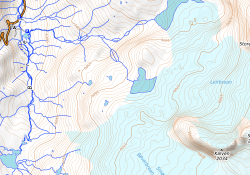 Gikk nordsida av Kalven, bregleppa er synlig, men ellers ingenting. Glissadesnø flere steder så stegjern og isøks er nødvendig.