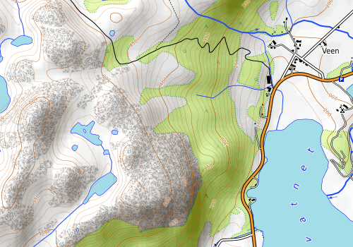 Start fra parkeringsplassen på Veen (husk betaling her!). Fulgte deretter veien frem mot gården hvor det er merket til Vådlandsnuten bl.a. Fin traktorveg oppover, så her går det radig oppover. Etter å ha passert 450m koten, så dreier traktorvegen mot nord, og her fortsatt jeg rett frem, oppover langs bekken som renner ut fra myrområdene nedfor Nauatjørnene. Fint terreng å gå i, spesielt nå på denne tiden rett etter snøen er gått. Gresset lå fremdeles klistret til bakken.