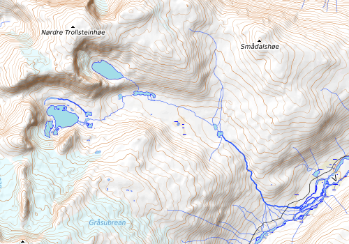 Eg hadde ikkje bestemt meg for eksakt rute, men heller å sjå an formen undervegs. Etter å ha spasert innover Trollsteinkvelven i nydelig og veldig lettgått terreng nådde eg urda som eg skulle tilbringe mykje av dagen vidare i. Frå her sto valget om å ta turen oppom Grjotbreahesten eller la den stå igjen til seinare. Eg vurderte det som lite trulig at eg kom til å orke å gå opp på den seinare på dagen, så for å unngå at den blei ståande igjen ubesøkt blei det først et besøk til denne brehesten.