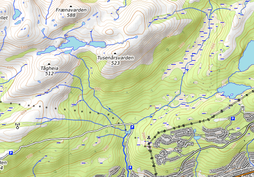 Stod opp tidlig og kunne raskt bekrefte at yr hadde rett. Tok meg derfor tid til en god frokost. Det lettet litt etterhvert og dermed ble det en tur i lokal-området. Startet fra hotellet og gikk opp mot Skihytta. Fortsatte så opp mellom Bjørsettjørna og Audunstjørna. Fikk ikke helt stier på kartet til å stemme med stier i terrenget så det ble litt kryssing over noen myrer før jeg fant meg en sti som førte opp til Middagsfjellet. På skiltene er det skiltet til Frænavarden. Toppen lå akkurat i skyene og samtidig begynte det også å regne, noe som det gjorde resten av turen.