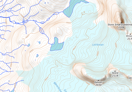 Vi tok en god lunsj på toppen. I mellomtiden hadde teltet vårt fått naboer, og Smørstabbreens Informasjonstjeneste kunne fra sitt utkikkspunkt per telefon forklare dem mulige veivalg mellom bregleppene rett opp til Kalven. Vi fortsatte bort til Skeies hovedtopp, og videre ned til eggen. Ved den øverste hammeren gikk vi litt ned til venstre. Espen syntes det var nok for i dag, og gikk vinter-renna ned til brekanten. Vi to andre tenkte å gå ned hele eggen for moro skyld, og ble litt overrasket over at hele eggen var lett forserbar uten at vi så noe behov for sikring. Masse klyving, men gode tak og kun noen få utsatte punkter. På eggens laveste punkt så vi imidlertid at tredjemann hadde klatret opp igjen og nå var et sted i veggen som ikke vi hadde gått. Han hadde klokelig avgjort at isen var for bratt, noe vi var helt enige når vi senere så den fra nedsiden. I stedet prøvde han å følge oss, men hadde tatt en annen vei som ble guffen. Petter jogga raskt opp igjen og hjalp ham på rett vei. Jeg venta til jeg så at de var tilbake på ryggen, så gikk jeg bortover mot Veslebjørn Vest så lenge for å titte. Lett klyving med et par utsatte punkter. Gikk så fort at jeg tok med meg toppen, så var det gjort hvertfall. Gikk tilbake og møtte de andre, og Petter løp en tur opp han også, siden neste dag ikke var helt planlagt. Kom oss greit ut på breen der ryggen var lavest. Måtte krysse en smeltesprekk, men klarte akkurat å skritte over til snøen. Snøbakken ned var bratt i starten, så vi sikra litt, men det gikk helt uproblematisk.